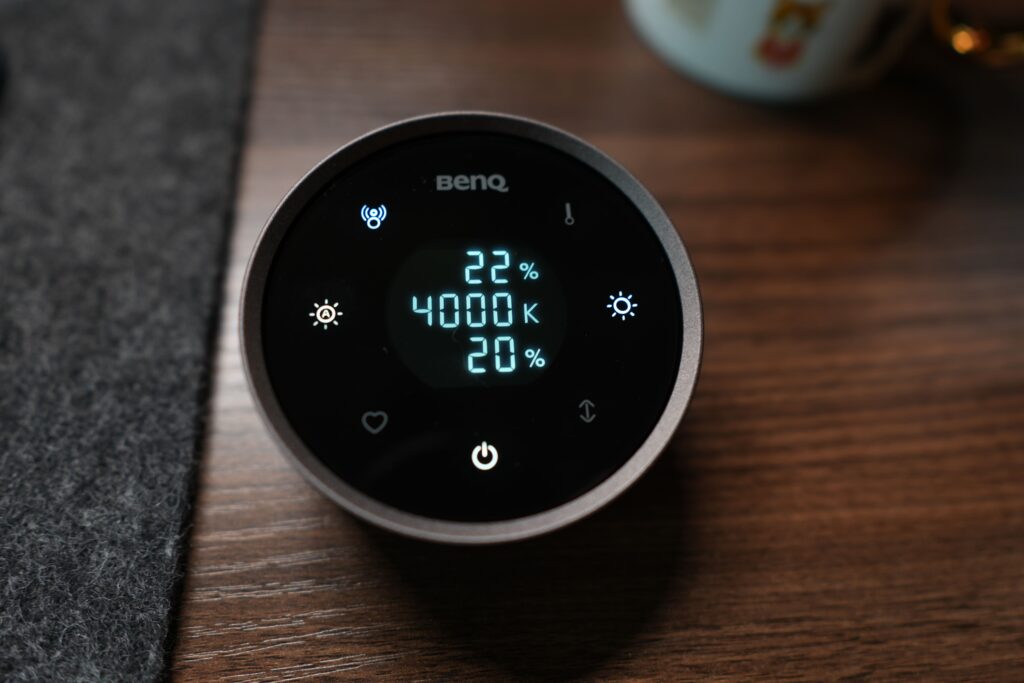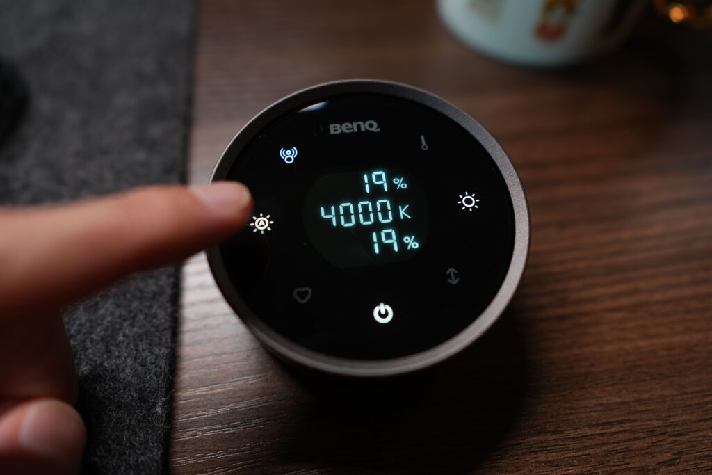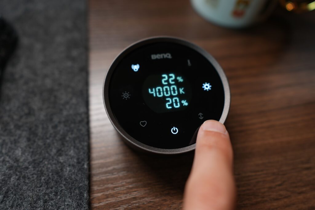 明るさや色温度の調整はダイヤル式となっており、縁の部分をクルクルと回すことで調整ができます。「ScreenBar Pro」のタッチ式での調整よりも、変更できるスピードが速く、液晶画面で数値を確認しながら細かい調整ができるので、個人的には操作がしやすく感じました。