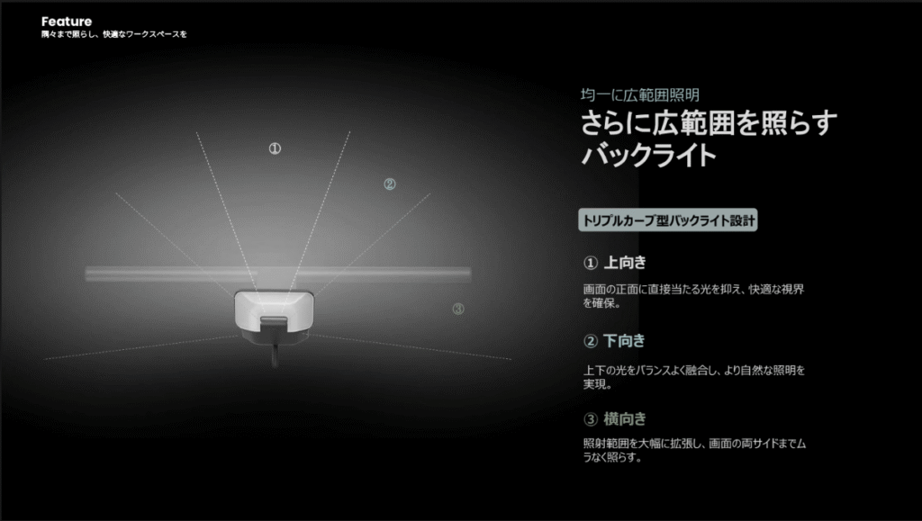 トリプルカーブ構造のバックライトにより、光が広範囲に広がります。前モデルの「ScreenBar Halo」よりも、423%広範囲に光が届くように進化しているとのこと。