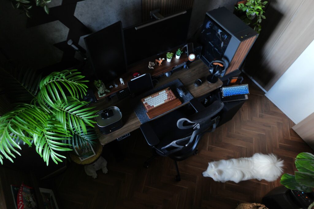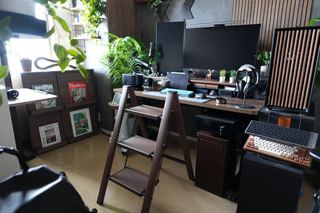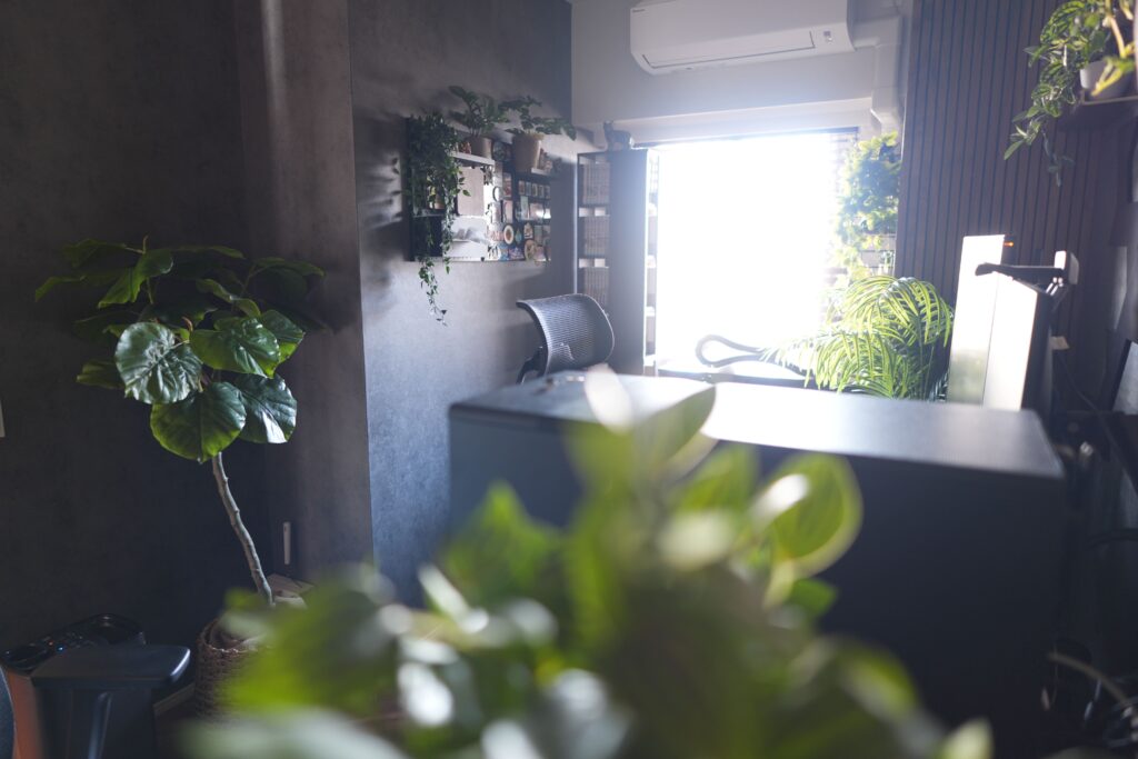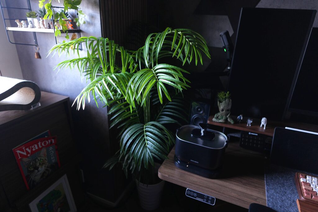 160cmと存在感のある大きさで、見た目も結構リアルなのですが、8,000円台で購入できるこちらのフェイクグリーン。デスク左側で存在感を放っています。