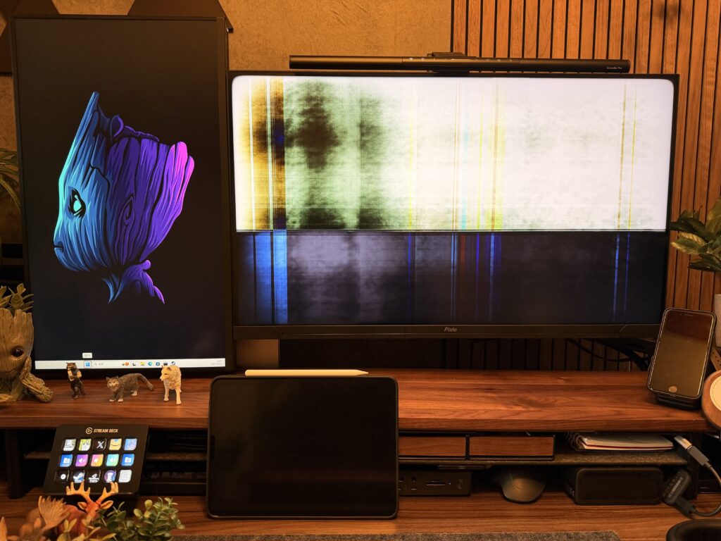先日突然モニターがこのような状況になってしまったのですが、日曜日に問い合わせフォームに症状等を入力し送信したところ、翌朝には交換対応となる旨の返信があり、夕方には交換品が発送され、火曜日には手元に届きました。