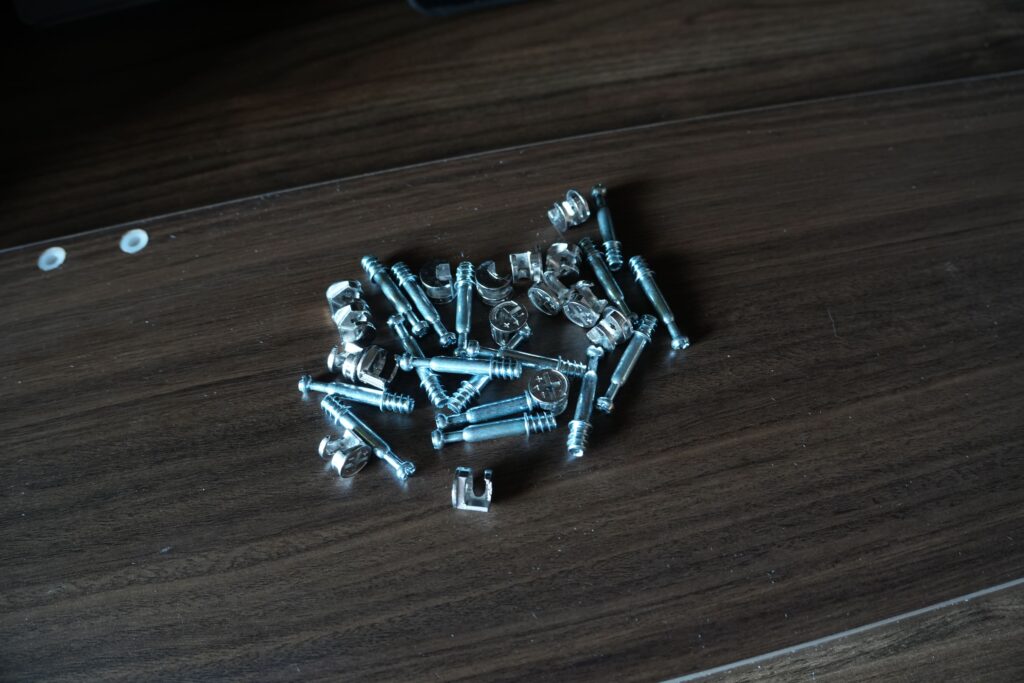 まずは天板と、4つ入っている短いパーツに締め付けネジを取り付けます。