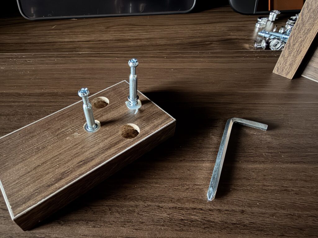 次に、長いパーツの穴に、先ほど取り付けた締め付けネジを差し込み、カムネジを締め付けます。
