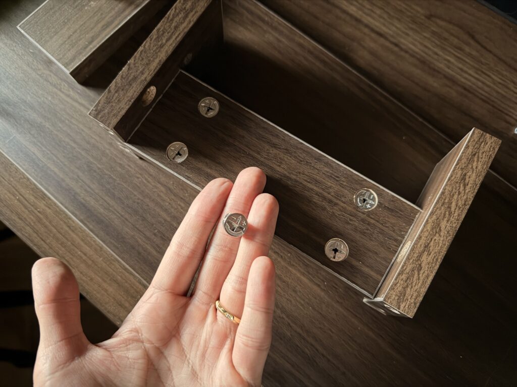 脚の底部に2箇所穴が空いていて、そこにネジを入れて固定すれば終わりというのを想像していたので、ネジの量を見てびっくりしました。笑