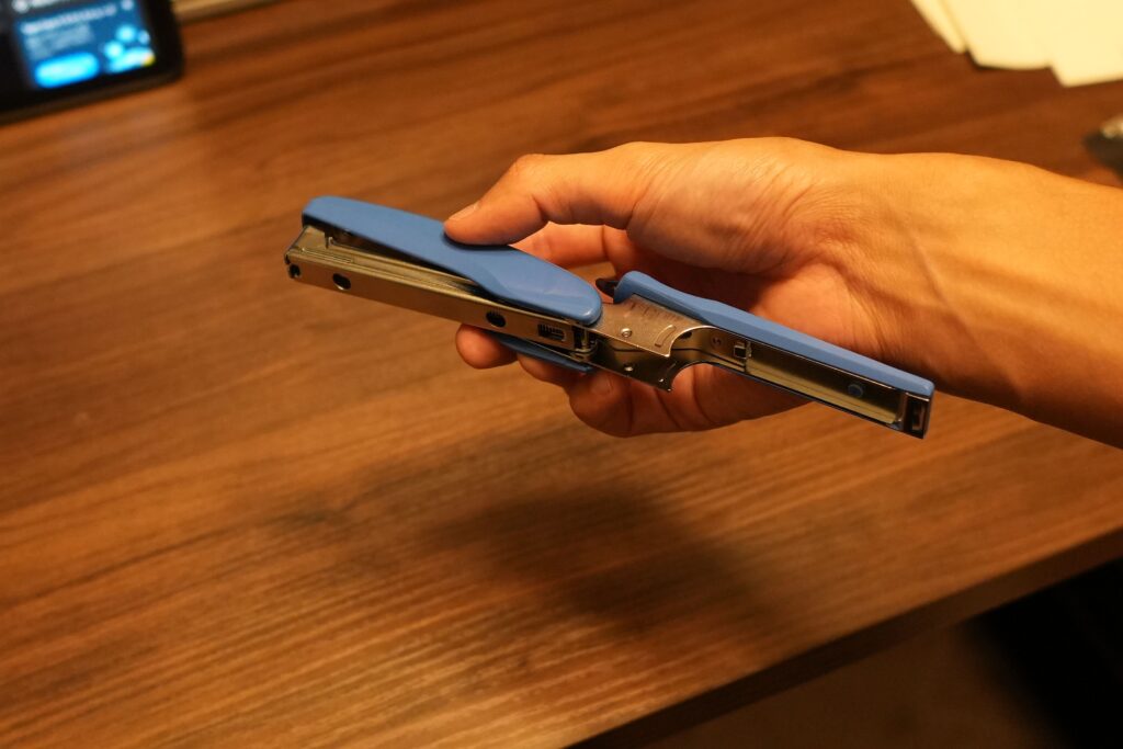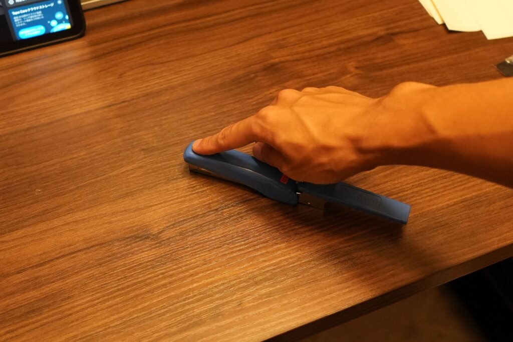 ホッチキスは180 度開くタイプであれば何でも構いません。このように開いて壁に打ち込んでいきます。